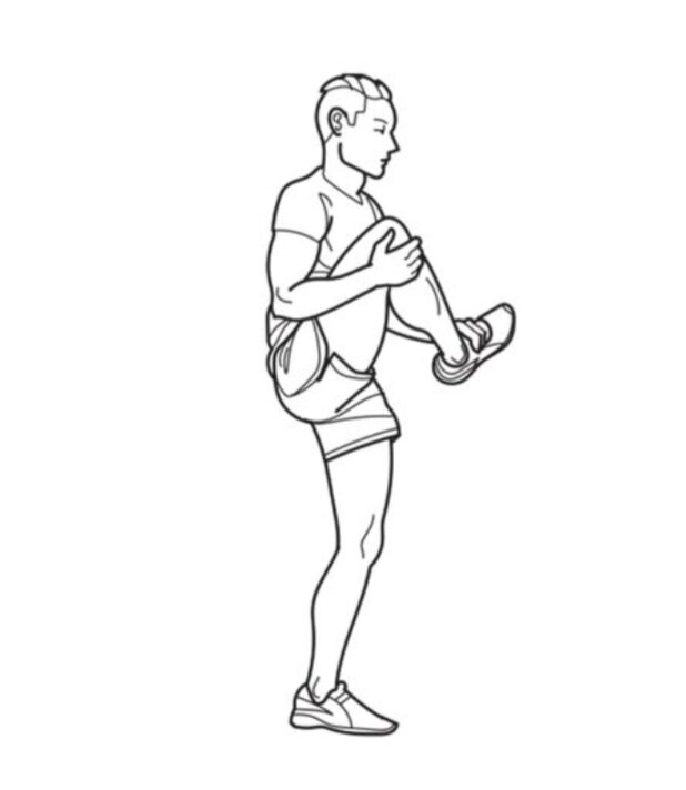 Как выполнять: обхватите одну ногу (придерживая её руками за лодыжку и колено) - поднимите её, и потяните назад, отпустите ногу, сделайте шаг вперед; затем поменяйте ноги. Через 30 секунд подтяните другую ногу, (придерживая рукой за лодыжку и колено) и подтяните назад насколько сможете, отпустите ногу, сделайте шаг вперед; затем поменяйте ноги. Выполняйте это упражнение продолжительностью от 30 секунд до 1 минуты.
