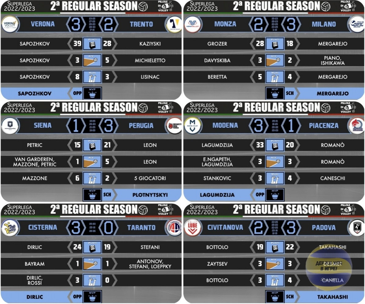 «Монца» — «Милан» — 2:3 (25:23, 25:23, 20:25, 23:25, 11:15) Второй тур стал идеальным, как для любителей волейбола! Только один матч завершился со счётом 3:0, а половина встреч прошла из пяти партий. Ну а главные сенсации тура выбирайте сами, их тут предостаточно! «Чивитанова» дома уступила «Падове» на тай-брейке. У победителей отличились японский доигровщик Ран Такахаши (22 очка) и серб Душан Петкович (21 очко). Иван Зайцев играл в качестве доигровщика из-за проблем со здоровьем кубинца Марлона Янта. «Перуджа» вернулась с тремя очками в кармане из соседней Сиены. Матч прошел не без трудностей для победител