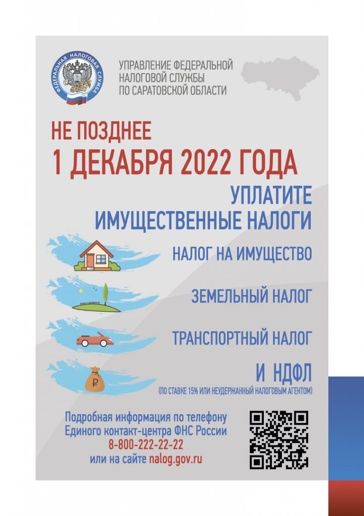 УФНС России по Саратовской области напоминает налогоплательщикам региона о необходимости заплатить имущественные налоги в срок не позднее 1 декабря 2022 года. По почте налоговые органы уже направили налогоплательщикам региона 1 млн налоговых уведомлений. Еще 350 тысяч уведомлений размещено в электронном сервисе ФНС России «Личный кабинет налогоплательщика для физических лиц». Направленные налоговые уведомления содержат начисления по транспортному налогу, земельному налогу, налогу на имущество физических лиц (в зависимости от наличия объектов налогообложения у налогоплательщиков) и налогу на доходы физических лиц. При возникновении вопросов, касающихся вопросов получения налогового уведомления, его структуры и порядка расчета имущественных налогов, следует обращаться к промо-странице «Налоговое уведомление — 2022». Кроме того, налогоплптельщик может задать вопрос по телефону Единого контакт-центра ФНС России 8-800-222-2222 (звонок из регионбов есплатный). Уплатить налоги согласно получе