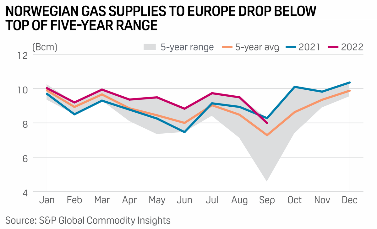 Поляки уже не знают кого бы им в чём-нибудь обвинить. Германия у них слишком много помощи себе выделяет, Россия собственную энергетическую инфраструктуру ломает зачем-то (Моравецкий и насчёт сегодняшней утечки на нефтепроводе "Дружба" сказал, что "многие признаки указывают на Кремль"), Брюссель денег не даёт. И далее по списку. Однако в последнее время, видимо, эти "старые песни о главном" всем порядком надоели, и Польша решила заняться подсчётом норвежских денежек. Итак, Норвегия, действительно, с одной стороны предстаёт как некий спасающий Европу герой, который изо всех сил якобы наращивает поставки в Европу. Правда рост составил только порядка 8%, и перспектив к его увеличению особо нет. А по сентябрю, к примеру, экспорт и вовсе сократился по причине ремонтных работ на норвежском континентальном шельфе: Однако действительно, сейчас Норвегия играет существенную роль в энергетическом секторе Европы, являясь её ведущим поставщиком природного газа. Тем не менее, несмотря на это, в Европ