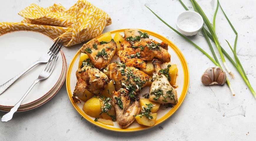 Ингредиенты: Начнем готовить! Для начала подготовим мясо. Для этого отделите от тушки курицы все ее части. Бедра, голени, грудку разрежьте пополам, уберите спинку и фаланги. Из последних двух лучше готовить бульон. Их мы не будем использовать в рецепте. Очистите чеснок от кожуры и мелко его нарежьте. Далее переложите мясо в глубокую тарелку. Добавите все приправы, наш мелко-нарезанный чеснок, оливковое масло и тщательно перемешайте, что бы маринад был правомерно распределен по всему мясу. Оставьте так на 3-5 часа. Пока маринуется мясо, займемся картофелем. Очистите от кожуры и нарежьте ломтиками. На самом деле можно нарезать как вам нравится, хоть соломкой, хоть колечками, на вкус это никак не повлияет. Далее достаньте рукав для запекания от отрежьте 50-60 сантиметров. Уложите туда картофель и курицу. Завяжите оба конца, а сверху сделайте 4-5 проколов для удаления пара в духовке. После чего запекайте в духовке 40-50 минут при температуре 190-200 градусов. Обязательно перед тем как ста