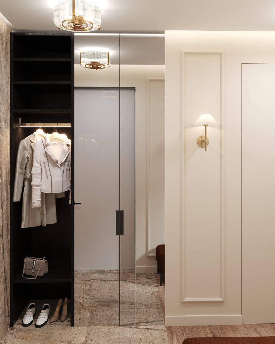 Небольшая прихожая часто встречается в планировках квартир и, зачастую, увеличить площадь входной зоны не представляется возможным. Однако, рациональное использование квадратных метров никто не отменял, и сегодня мы расскажем, как в проектах дизайн студии «Мастерская Комфорта» мы создаем функциональные и красивые интерьеры прихожей. Первое, и пожалуй, главное правило – ничего лишнего. Жители большинства городских квартир сталкиваются с неприятным ощущением темного и тесного пространства, которое реально видоизменить, отказавшись от громоздкой и не всегда нужной мебели и антресолей. Стоит отказаться от створчатых шкафов в пользу шкафов-купе, желательно, с зеркальными фасадами. Если размер помещения не позволяет установить шкаф, таком случае необходимо продумать гардеробную, в которой будет храниться несезонная одежда и обувь, а оптимальным решением станет вешалка в виде планки, на которой крепятся крючки на разной высоте, Полка для обуви также должна быть компактной и предназначаться т