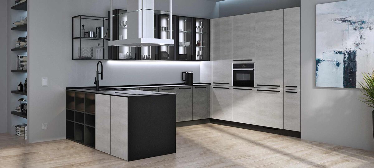 Важное место занимает современная фурнитура — она помогает использовать внутреннее пространство шкафов по максимуму. Выкатные конструкции позволяют легко достать нужные вещи даже из самой глубокой точки угловой тумбы. Различные удобные варианты открывания тоже упрощают процесс: например, очень удобно, когда можно просто нажать на дверцу шкафа и система push-to-open сама откроет ее.