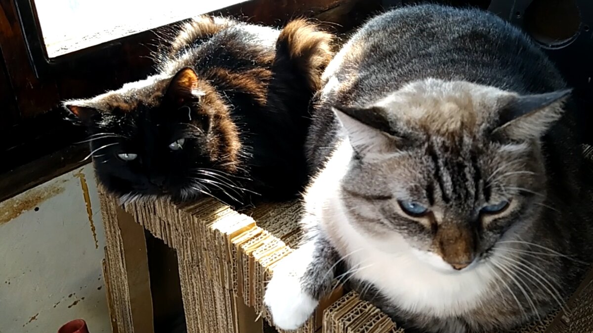 Мои коты на редкость дружно греются под солнцем на верхнем этаже домика. Ни кто из котов ни кого из котов не обижает. А все потому, что они оба обижали меня и теперь, на меня же дуются. Им обоим, видите ли, не понравилось, что я их кормил кошачьим кормом, а не своей едой. Из-за этого, они поели с явным отвращением ко мне, неохотно, но съели всё. И теперь обида на меня их трагически объединяет. Полагаю, еще с часок они подуются, пока солнце на этой стороне, а потом придут греться на мне. Ведь я им должен!
