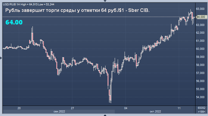 Рубль, скорее всего, завершит торги среды у отметки 64 руб./$1 - Sber CIB Курс доллар/рубля на Мосбирже интервалами в 1 минуту Курс доллар/рубля на Forex интервалами в 4 часа Рубль, скорее всего, завершит торги среды у отметки 64 руб./$1, считают эксперты Sber CIB. "Доллар в среду утром снова начал дорожать и почти достиг 64,8 руб./$1. Полагаем, что рост отражает скорее не слабость рубля, а избыточный спрос на доллар на локальном рынке. Компании стремятся как можно быстрее вывести доллары за рубеж. Доллар на локальном рынке на 3% дороже, чем на глобальном. По мнению аналитиков, есть первые признаки стабилизации ситуации. С учётом активных продаж валюты экспортёрами рубль, скорее всего, завершит торги близко к 64 руб./$1", - отмечают аналитики Сбербанка. Цены на Brent сегодня утром опустились - до $93,8 за баррель. 12 октября выйдут ежемесячные отчёты ОПЕК и Управления энергетической информации США (EIA), а также еженедельные данные по запасам от Американского института нефти (API). Наи