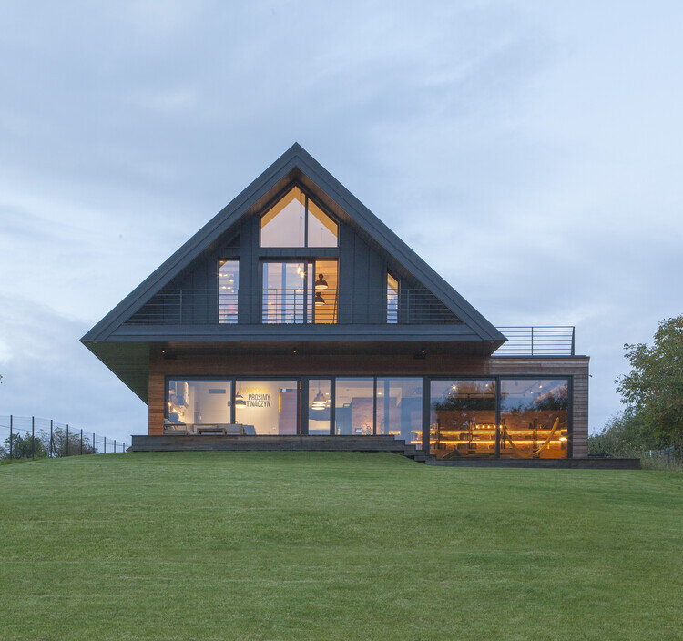 Коттедж с карнизной пирамидой - это дом, вдохновленный польской деревянной аркадной архитектурой. Карнизные дома, расположенные на рыночной площади Лянцкороны, являются интересным примером таких архитектурных решений. Проектируя дом, архитектор следовали правилам, предусмотренным в Плане застройки территории, который допускал только одноэтажный дом с двускатной мансардой. Несмотря на строгие правила, удалось создать интересную структуру здания. Необходимо было творчески использовали топографию живописного участка земли и разделить целых пять разных уровней, юридически подпадая под определение двухэтажного здания. Первый этаж со стороны входа и входа в гараж соединен с существующим уровнем земли. Затем в гостиной – кухне и столовой – уровень слегка наклонен, открывая высокие интерьеры с великолепным видом. Дальше, прямо на первом этаже, расположена гостиная. В центральной части гостиной, где разместили камин, образуется многоступенчатый перепад. Он прорезает панорамное остекление и прод