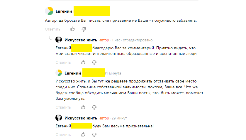 Вот и наш бедолага порекомендовал автору «умолкнуть». Вот такой способ унижения.