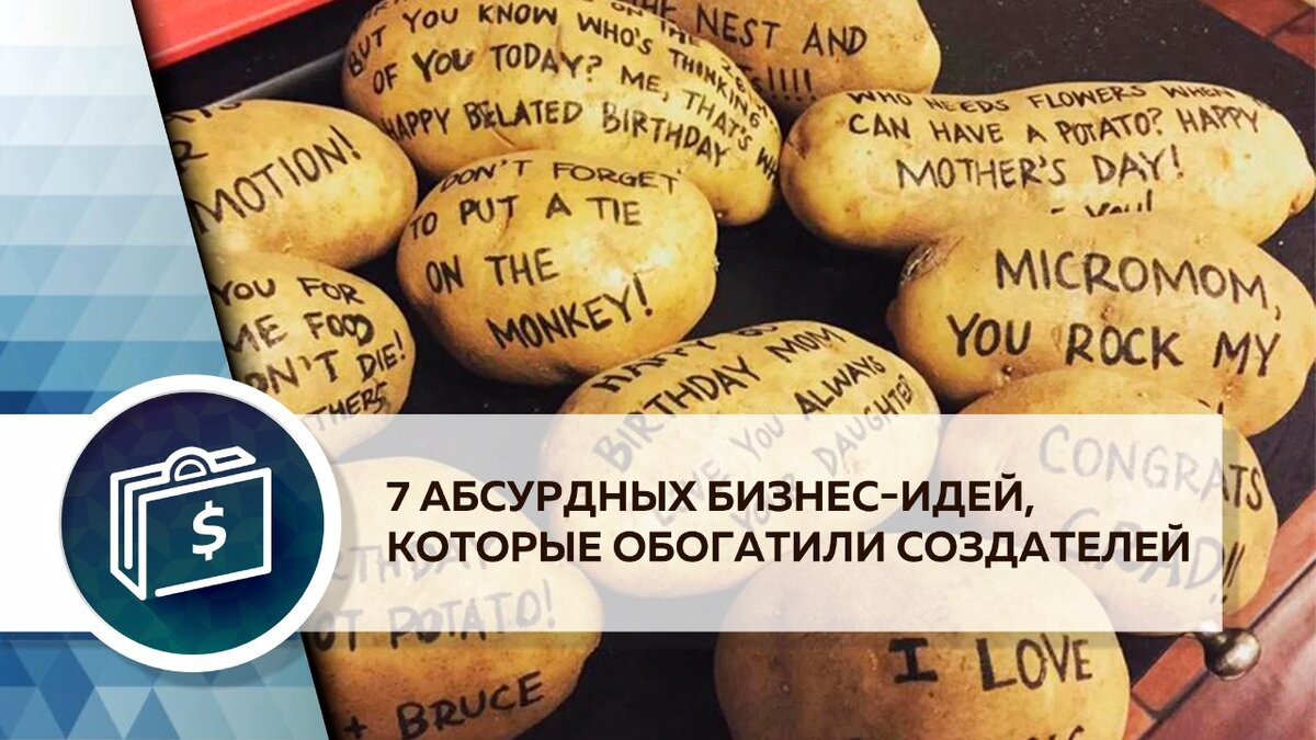 Наверное, каждому приходили в голову необычные идеи, но из-за сложности или авантюрности они так и оставались нереализованными. А может и зря? Мы собрали примеры самых странных бизнесов, которые несмотря на свою причудливость принесли своим создателям деньги. Послание на картошке Представьте мир, в котором вместо открытки, вы каждый раз бабуле картофелину. Именно на такой странной идее и зарабатывают популярные в США сервисы PotatoParcel и MysteryPotato. Людям предлагается отправить поздравление, телеграмму или картинку (за отдельную плату), написанную на картофелине, упакованной в коробку. Несмотря на то, что сервисом можно пользоваться анонимно, создатели запрещают отправлять угрозы и оскорбления. Цена услуги начинается от 10$. Одеяло для лица Вы когда-нибудь просыпались от того, что у вас замерзло лицо? Причём укрыться с головой не поможет — ведь становится нечем дышать. Почему ещё никто не сделал одеяло для лица? Создатели the Face Blanket «серьёзно» подошли к вопросу. Они вы