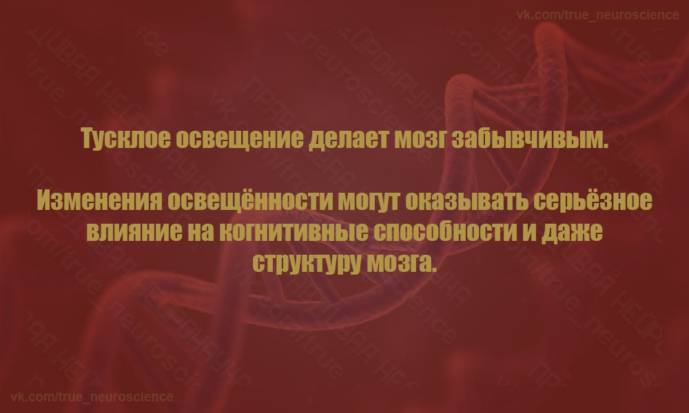 Тусклый свет способствует забывчивости. Изменения освещённости оказывают значительное влияние на когнитивные способности и даже структуру мозга. Источник: статья "Жизнь в сумерках делает мозг забывчивым" в Science-digest.