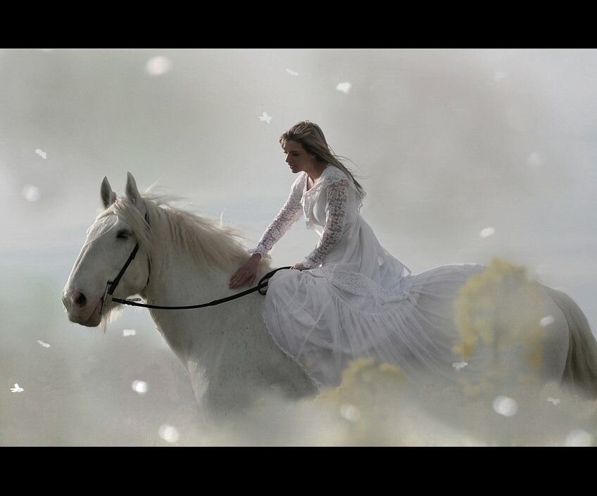 И тут я увидел. Она ехала на своей белой кобыле. Лошадь двигалась бесшумно. Словно плыла. И вокруг неё переливались огоньки в легком тумане. Это была Стеша. На ней было белое подвенечное платье. Я стоял и заворожённо смотрел. Не мог сдвинуться с места. Она ехала на лошади и пела. Хотя рот её был закрыт. Но я слышал её голос. Я хотел крикнуть, что я здесь, посмотри на меня, но почему-то не мог. А она не видела меня. Всматривалась куда-то вдаль. Искала кого-то глазами...