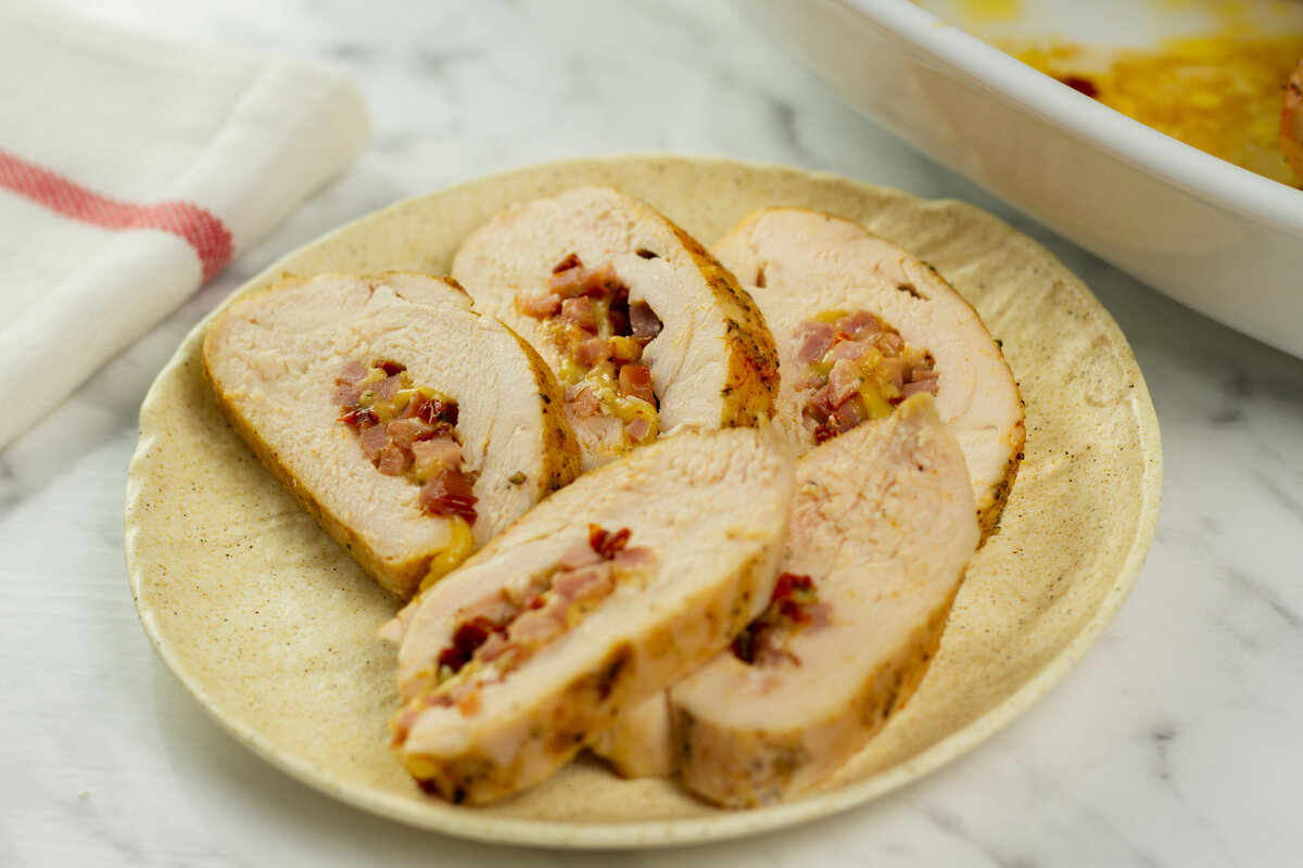Отличная идея для ужина, закуски, а так же на бутерброд. Такая курочка хороша и в теплом, и в холодном виде. Красиво выглядит и имеет яркий вкус. Слегка копченые нотки придают паприка и ветчина. Сыр аппетитно плавится. Мясо получается нежным благодаря способу приготовления.