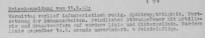В первой половине дня пехотных боевых действий не велось. Велась разведка, продолжались шанцевые работы. По передовой линии и тыловым районам противник вёл беспокоящий артминомётный огонь. Конфигурация передовой линии с вечера 10.9.42 осталась неизменной.