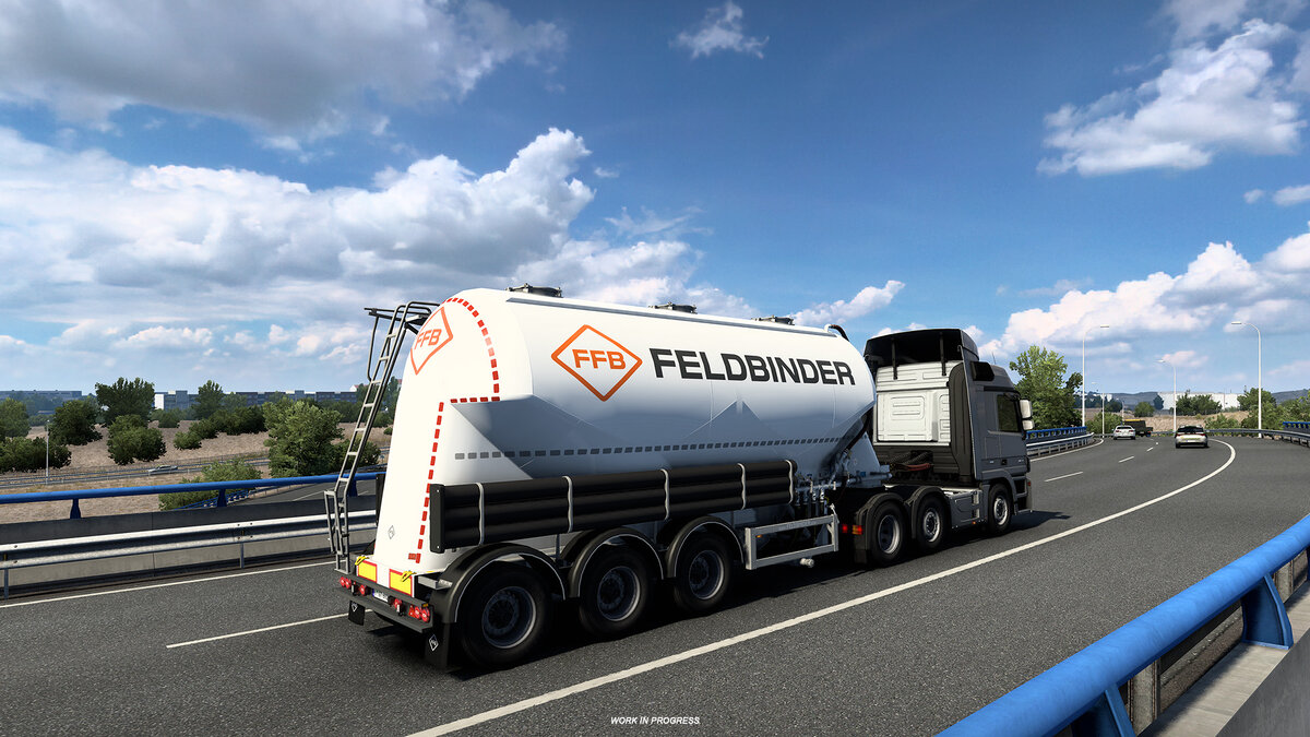 В прошлом году небольшая группа наших художников по транспортным средствам отправилась в Германию и посетила Feldbinder Spezialfahrzeugwerk GmbH, чтобы проверить свои удивительные автомобили на двух объектах в Винзене и Лютерштадте, Виттенберг. Там они собрали много информации и отзывов о типах прицепов, которые они производят, и поговорили со многими из команды, которая там работает! Сегодня мы рады поделиться с вами некоторым прогрессом, достигнутым с прицепами Feldbinder, которые появятся в Euro Truck Simulator 2. Как видно из этих скриншотов, наша команда уже довольно давно работает над этими прицепами. Можно с уверенностью сказать, что мы близки к финальной стадии разработки этих новых дополнений! Пока наши команды все еще усердно работают над этим проектом, и мы уверены, что эти трейлеры могут быть выпущены до конца года; мы пока не можем подтвердить дату релиза! Мы обязательно сообщим вам, как только мы на 100% установим дату выпуска.