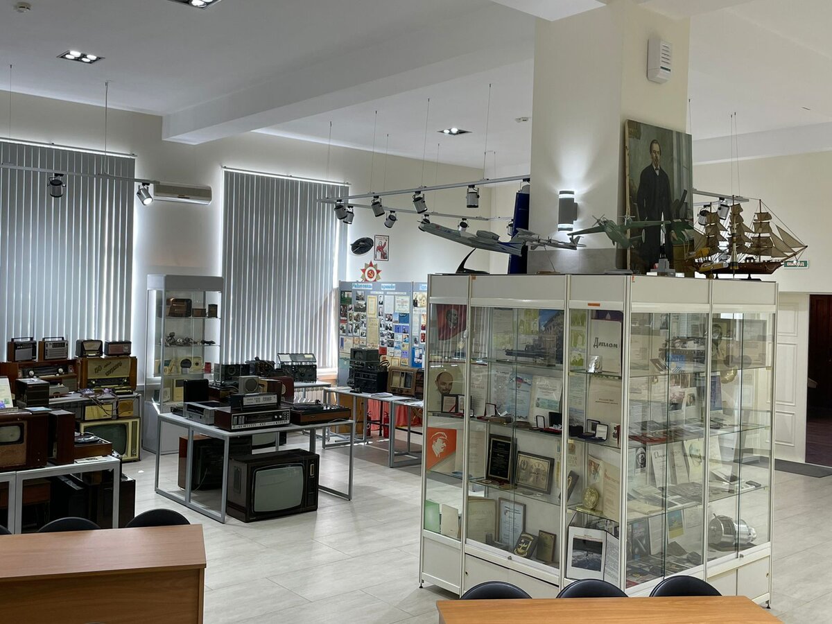 В составе музейного собрания представлено много интересных артефактов, среди которых радиоприемники и радиоприёмные устройства – начиная с аналога первого в мире радиоприемника изобретателя радио Александра Попова, действующего репродуктора 30-40-х годов ХХ века, который воспроизводит запись приказа Сталина об освобождении города Таганрога от фашистских захватчиков 30 августа 1943 года, озвученный диктором советского радио Юрием Левитаном (запись была подарена будущему директору музея Олегу Набокову Левитаном лично во время ХVI съезда ВЛКСМ в 1970 году). Также здесь демонстрируются репродукторы разных лет, старинный действующий граммофон, ключ азбуки Морзе, телефон с подводной лодки, полевая и аварийная авиационная рации, гироскопическая платформа ПГ-1В-И, армейские радиоприёмники военных лет, лабораторные приборы кафедры теоретических основ радиотехники первых лет работы ТРТИ.