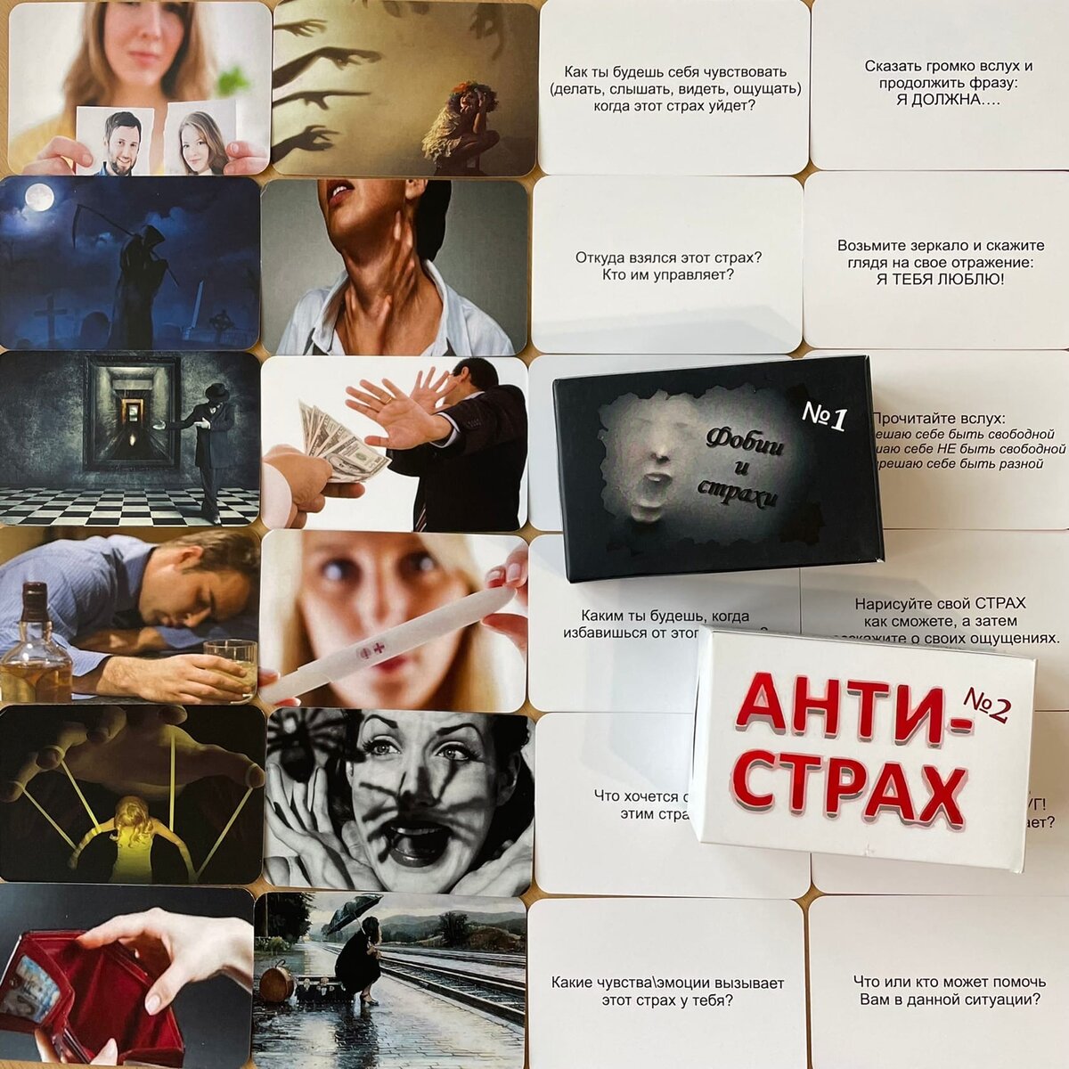 Я боюсь… Выступать публично, водить машину, летать на самолёте. Часто с такими страхами обращаются к психологу. Все мы чего-то боимся. Но только мы сами решаем, что делать со своим страхом: оставаться в его плену или прорабатывать. Сегодня хочу познакомить вас с интересной колодой для работы с темой страха «Антистрах». Зачем вообще работать со страхами? Страх часто блокирует энергию, и мы впадаем в ступор или хаосные действия: беги или замри. Страх несет в себе как негативный, так и позитивный заряд. Чтобы высвободить этот заряд, нужно для начала его разблокировать, а затем трансформировать в позитивный. В этом и помогает работа с колодой «Антистрах». Комплект создан для комплексной глубинной проработки страхов, которые мешают нам жить и радоваться жизни. В психологии есть разделение на фобии и страхи. Когда мы боимся пауков, это фобия, а когда боимся начать что-то новое, потому что нас засмеют — это страх. Часто они всплывают фоном, когда люди начинают работать с целями. Например, одн