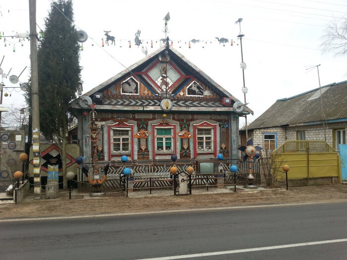 Чёт слабовато ты сфоткал:) Я тогда немного дополню из своего архива пожалуй!:) Если память не изменяет, то это кажись было в 2017 году. Отвозил жену брата в санаторий, и точно помню что эта деревня была где-то рядом с рекой Березина, или Минская область или Могилевская... Сие уже не помню! Домик конечно очень колоритный, если можно так сказать! Сходу так не уверен, но возможно это дача Киркорова или Леонтьева! Тут тебе и телевизоры, и колпаки пластиковые для колёсных дисков, и куча шаров, и фигурки разных животных вырезанные из жести, и якорь... В общем много и рассматривать это можно долго! Особенно меня позабавили висящие пластиковые бутылки наполненные на 1/3 песком, дальше смысл именно применения бутылок в инсталляции проясняется!:) Стиль дома выдержан и в оформлении ворот, разве что здесь добавлены антенны на длинных мачтах и скворечники! Но хозяин продолжает придерживаться своего стиля!:) Гараж выглядит менее нагруженным разными элементами декора, но за то присутствует религиозны