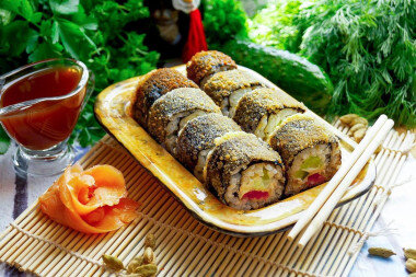 Ингредиенты: Нори 5 гр. Рис 120 гр. Огурцы 0.5 шт. Красная рыба 100 гр. Рисовый уксус 2 стол.л. Сахар 0.5 чайн.л. 1 Яйцо Панировочные сухари 3 стол.л. Растительное масло 100 гр. Соль по вкусу. Как сделать темпура роллы в домашних условиях? Подготовьте все ингредиенты, указанные в рецепте. Для начинки возьмите слабосолёную сёмгу, лосося или горбушу. Очень удачно со всеми продуктами будет сочетаться авокадо, поэтому по возможности используйте его тоже. Рисовый уксус влейте в небольшую глубокую ёмкость, добавьте сахар и тщательно всё перемешайте до тех пор, пока сахар полностью растворится. Рис промойте в чистой холодной воде. Отправьте его в кастрюлю, залейте водой, посолите по вкусу и отварите до полной готовности в течение 12-15 минут. Влейте в готовый рис уксус, перемешайте и оставьте минут на 20, чтобы рис остыл. На ровной поверхности расстелите коврик для формирования роллов. Сверху выложите лист нори гладкой поверхностью вниз. Распределите ровным не очень толстым слоем отварной ри
