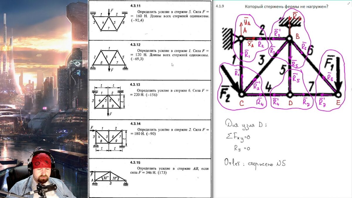 Продолжаем разбираться с теоретической механикой, ещё немного видеоуроков. Тема 4.1. Статически определимые и статически неопределимые фермы. Ненагруженные стержни (задачи с 4.1.1 по 4.1.9): Тема 4.2. Способ вырезания узлов (1 из 2) (задачи с 4.2.1 по 4.2.10): Тема 4.2. Способ вырезания узлов (2 из 2) (задачи с 4.2.11 по 4.2.20): Тема 4.3. Метод сечений (1 из 2) (задачи с 4.3.1 по 4.3.8): Тема 4.3. Метод сечений (2 из 2) (задачи с 4.3.9 по 4.3.15):
