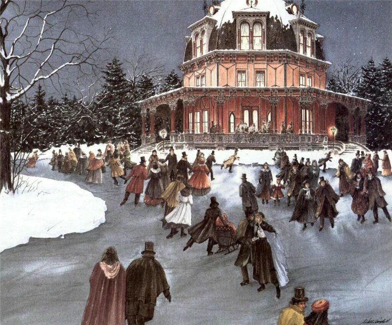 Встреча наших Ромео и Джульетты девятнадцатого столетия произошла на одном из катков городского парка прямо накануне новогодних празднеств. Представьте романтику зимнего вечера.