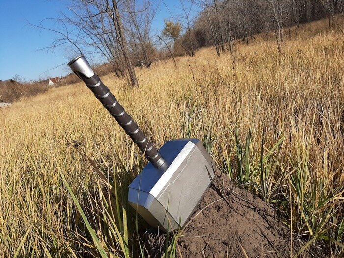 Всем привет! Захотелось однажды отдохнуть от макетов стрелкового оружия и сделать что-нибудь "холодное". В общем, встречайте деревянный макет молота Тора. Кому интересен подробный процесс изготовления с объяснением - для вас внизу есть ролик с моего Ютуб канала, а также ссылка на шаблон:) Сам молот можно было бы сделать в виде коробки (взять несколько прямоугольников, собрать пустотелую деталь), но мне кажется, это сложнее, чем склеить множество слоёв листового материала, в моём случае МДФ). Плюс,бутерброд" надёжнее и тяжелее, а тяжесть - это хорошо, да, Борис - хрен попадёшь?) Угловая шлифовальная машина (болгарка), Рашпиль, напильник, наждачная бумага - с помощью этих инструментов, я проводил обработку изделия. Выпиливал слои электро лобзиком. Потом приклеил на основу утолщения из переплётного картона. Белые следы, которые вы видите на фото ниже, это суперклей с содой. Данным составом заделал перепады в слоях поделки. Шпаклёвка по дереву показалась ненадёжной для этого. Шпаклю не исп