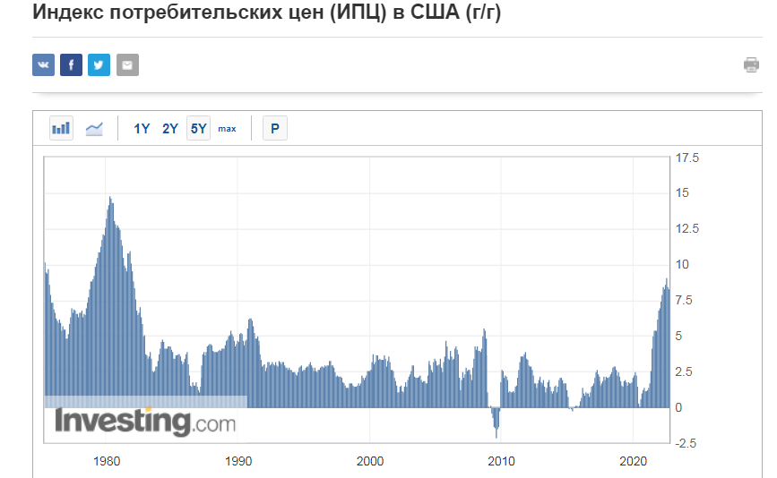 Как видите в Штатах всё не так уж и плохо. Бывало и хуже. При СССР в 1980-х. Когда путем гонки вооружений пытались его разорить. Самим тоже было не очень хорошо. 15% инфляции. Но СССР рухнул. Правда его тогда не разорили, а обманули. Но инфляция резко упала и больше так не поднималась. До 2021 года. В 2008 году инфляция ушла в минус. Это был вообще шок. Ипотечный кризис. Деньги чуть не с вертолетов пришлось разбрасывать. Банковский процент был в минусе. То есть отдавать банку надо было меньше, чем брал в долг. Потом инфляция была комфортная, около двух процентов. И вот вчера инфляция за сентябрь 8.2%. И опять Россия. И опять по инициативе самих США. Они надеются, что инфляцию удалось победить.Только на этот раз победят не они. Третий месяц инфляция уменьшается. Потихоньку, но уменьшаются. Вот только Россия сдаваться не собирается. Посмотрим, что происходит в мире. Конечно Америка, это большой остров, но не совсем изолированный океанами. Выплыть в одиночку у нее не получится. Основной