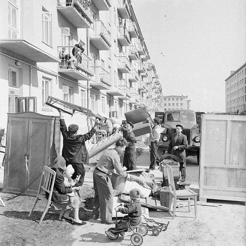 Рассказ о мирной революции начала 60-х, о массовом переезде из бараков и изб в квартиры, вызвал столько читательских воспоминаний! Это - как страницы будущей летописи (захотим же мы когда-нибудь засесть за мемуары?) И ведь всем, решительно всем невзрачные, вроде бы, квартирки вспоминаются как СЧАСТЛИВЫЕ. В этих "панельках" жило счастье. Начало разговора здесь: Массовый гипноз? Большие надежды? Нет, прежде всего это был очевидный прорыв. В будущее. Никому и в голову не приходило что через полвека внуки разглядят какую-то романтику в дровяных печках и колодцах. Нет, мы в детском саду бодро барабанили: - Никто по воду не ходит, Коромысла не берёт: Стали жить по новой моде - Завели водопровод! И так повсюду. "От Москвы до самых до окраин". Но ничуть не хуже документальных фотографий это эпохальное "великое переселение народов" передают рисунки самого популярного в те годы журнала "Крокодил". Чтобы в полной мере оценить это эпическое полотно, его надо увеличить. Разглядывать можно бесконе