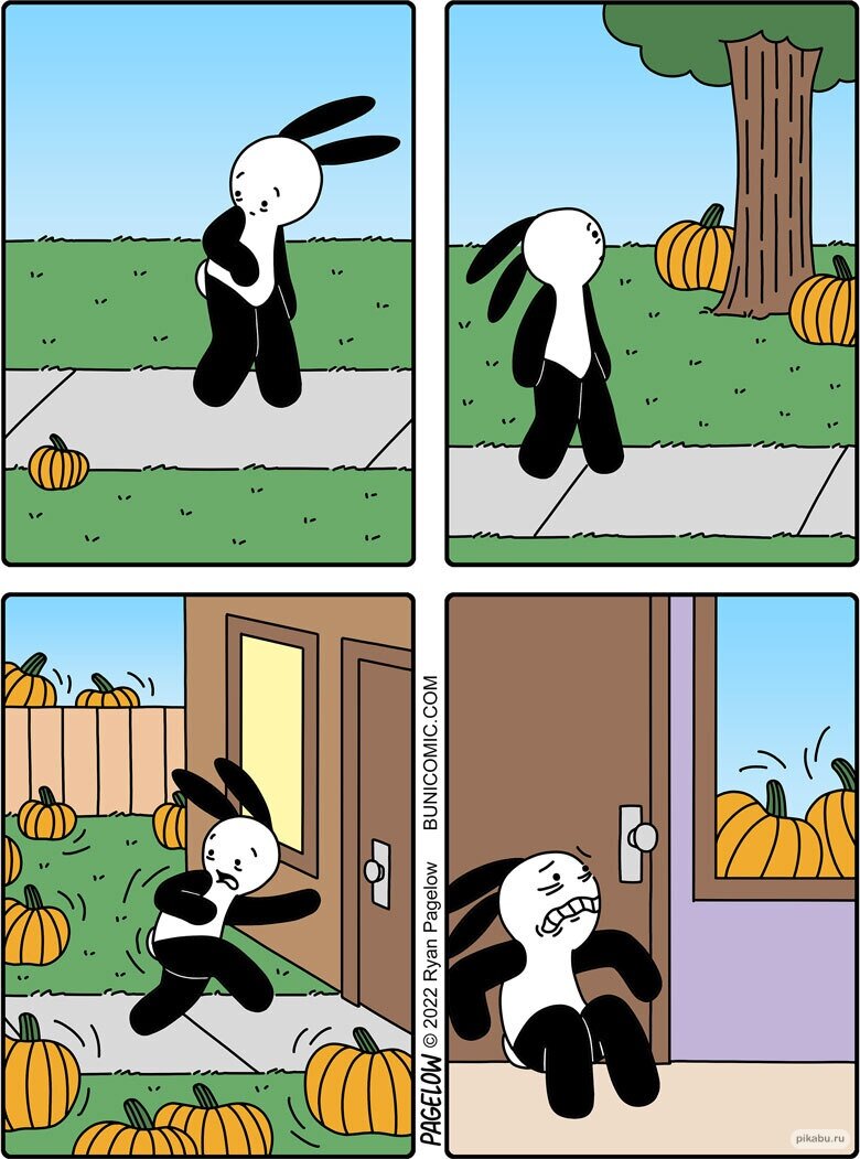 Привет, дорогой друг! Приближается конец октября, а это значит, что совсем скоро можно будет отмечать Хэллоуин . Да, для нас этот праздник не имеет такого глубинного значения, как для американской культуры, но традиция придумывать костюмы страшных монстров классно поднимает настроение. Сегодняшние комиксы я бы хотел посвятить именно этому празднику и привидениям, зомби и другим разным монстрам, которые чувствуют себя прекрасно в этот день. Надеюсь, этот #юмор (несмотря на то, что он не посвящен исконно русскому празднику) все равно заставит тебя улыбнуться. Символом Хэллоуина является тыква, и в преддверии праздника эти овощи появляются у каждого дома. Наверно, именно из-за такой их популярности художнику Райану Пэйджлау начинает казаться, что они повсюду. Чем круче и страшнее твой костюм, тем большей популярностью ты будешь пользоваться в День всех святых. Можно смело проявлять всю свою креативность. Хотя художник Евгений Федотов считает, что сильно страшными делать костюмы все же не
