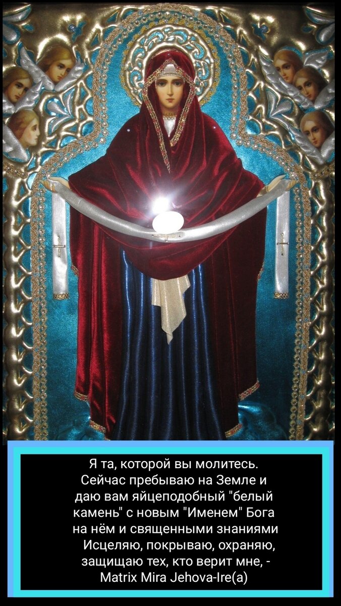 Пресвятая вновь на Земле, но уже как Утешитель от Христа и Посланник от Создателя Мира с тайным "белым камнем и Новым Именем Бога на нём".