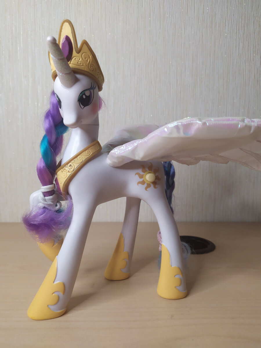 Всем привет! Сегодня мы обозреем главную правительницу Эквестрии — принцессу Селестию! Для тех, кто тут впервые. Это канал про вселенную "My little pony" и про все что с ней связано. Заваривайте чаёк и поскакали! 🐎 Селестия — могущественная и величественная пони. Но использует она свое могущество только в добрых намерениях. Белый аликорн высотой 20 см с сиреневыми глазами и блестящими тенями. Рог усыпан блёстками. Крылья очень большие, и также блестят и переливаются. Грива непростая, а трёхцветная: в ней присутствуют бирюзовый, розовый и фиолетовый цвета. Косички выглядят очень эффектно! В хвосте нет четкого разделения, всё вперемешку, но ясно виден голубой и фиолетовый цвет. Знак отличия сделан в виде ясного солнышка, потому что Селестия поднимает солнце, да и сама она светлая как день. Но все не так просто. Это не просто знак, а кнопка, при нажатии на которую, поднимаются крылья. Также она умеет издавать разные звуки. Но моя Селестия сейчас молчит, из-за того, что батарейки разря