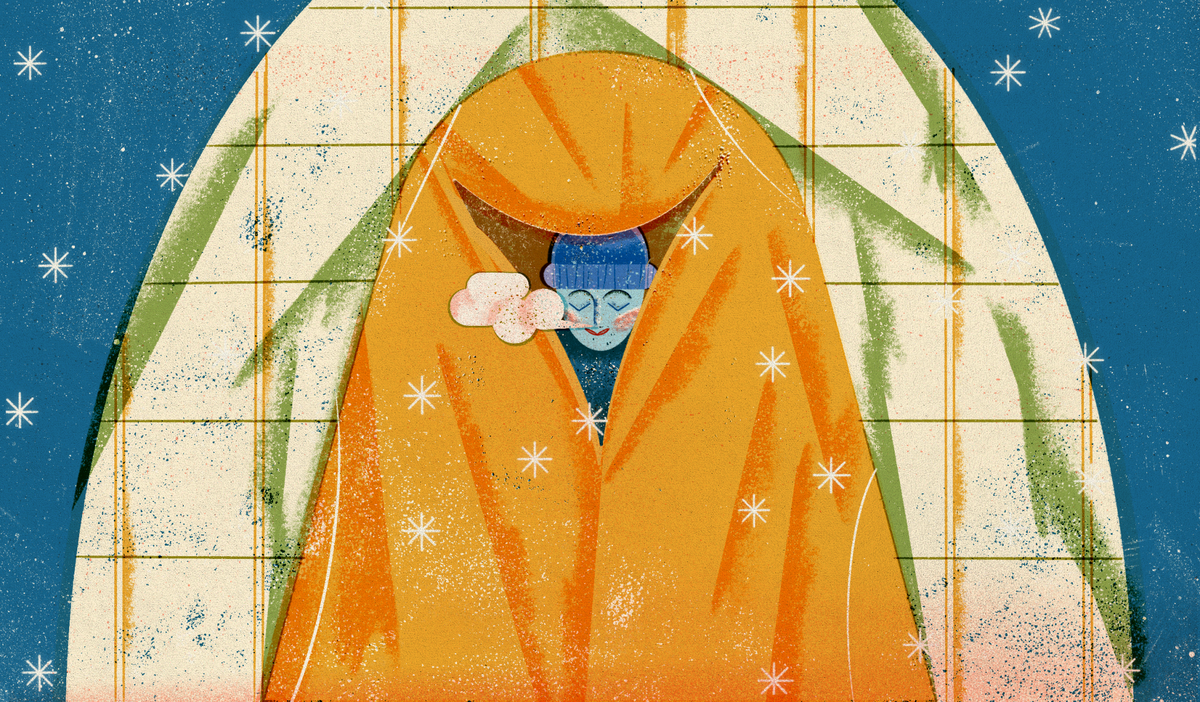 - После того как температура тела повысится, сохранять пострадавшего сухим и укутанным в тёплое одеяло, в том числе голову и шею.