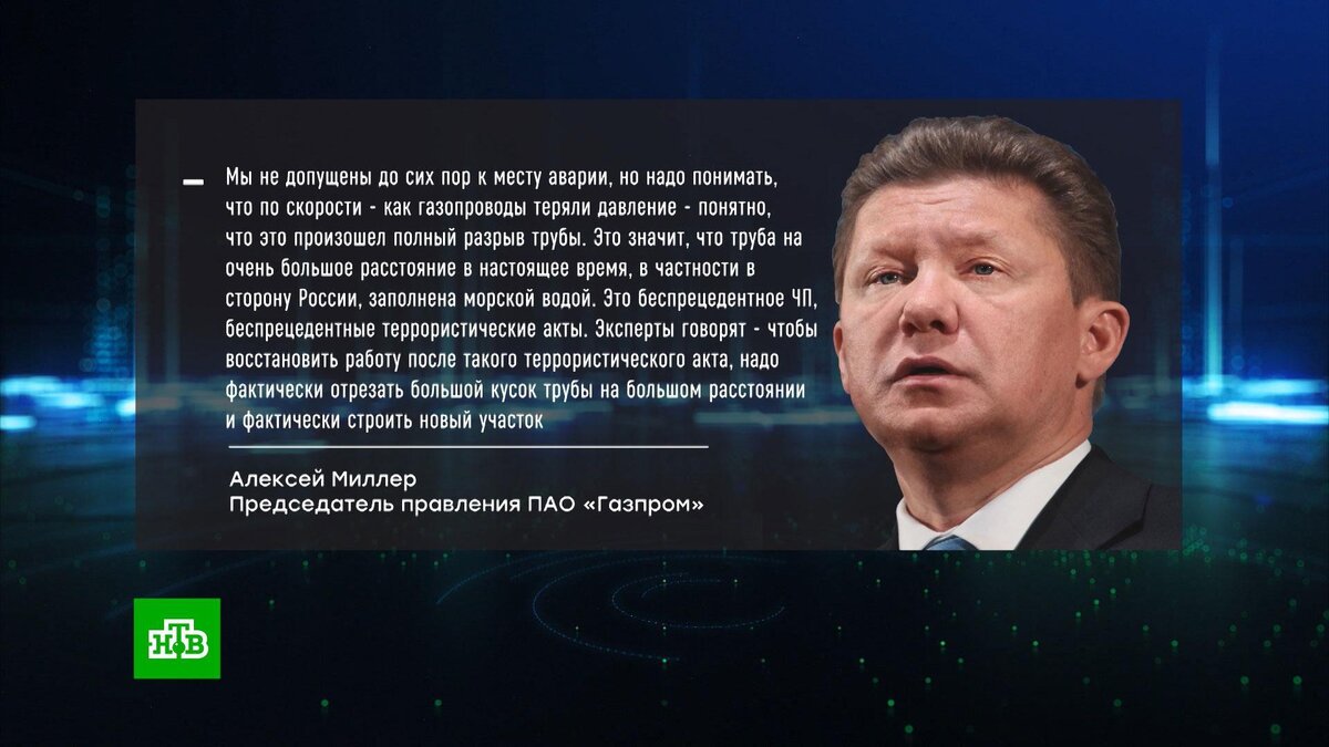 [ Смотреть видео на сайте НТВ ] Поврежденные нитки «Северного потока» заполнены морской водой, для их ремонта необходимо отрезать и заменить значительную часть трубы. Об этом сообщил глава «Газпрома» Алексей Миллер. По словам главы «Газпрома», российскую сторону до сих пор не допустили к месту аварии на газопроводе, но российские специалисты проанализировали скорость, с которой нити «Северных потоков» теряли давление, и сделали вывод, что произошел полный разрыв трубы. Чтобы восстановить, ее нужно поднять на поверхность. А сделать это будет сложно, поскольку конструкция заполнена водой на сотни километров. Кроме того, по словам Миллера, пока никто из европейских партнеров не заявил о желании восстановить взорванные нитки. Зато интерес проявляет Турция. Анкара приветствовала предложение Владимира Путина создать в республике газовый хаб для поставок топлива в другие страны, в том числе в Европу. По словам Миллера, мощности новой газотранспортной системы через Чёрное море могут быть сопос