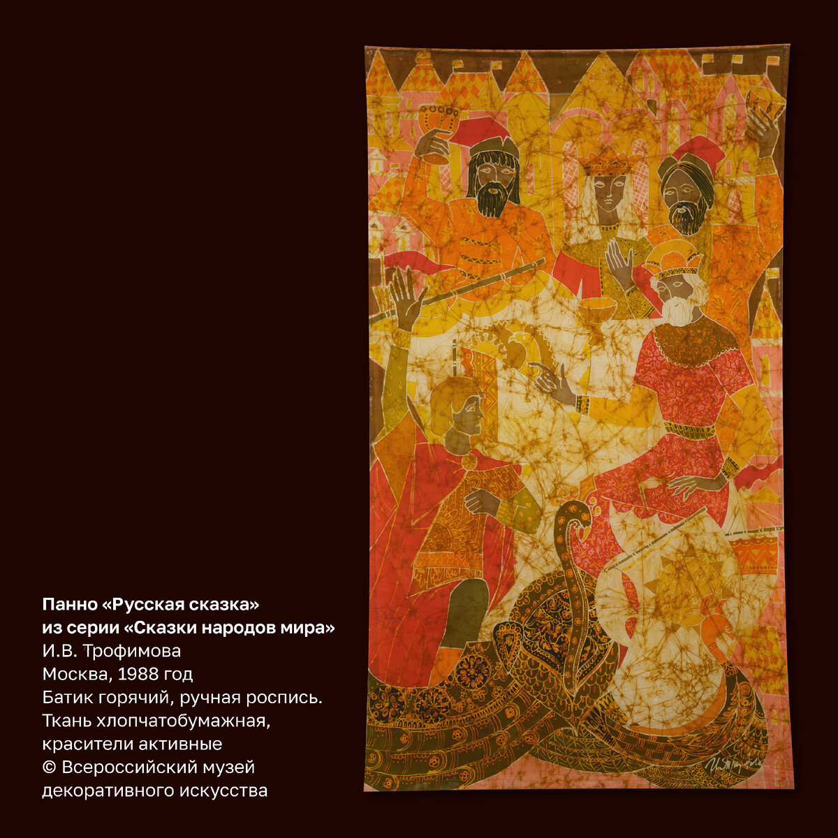 Продолжаем показывать произведения Ирины Трофимовой – прекрасного художника, одного из ярких авторов отдела тканей Всероссийского музея декоративного искусства. В прошлой публикации мы начали рассказ о Ирине Вадимовне, ее монументальных панно-батиках, и о самом батике (немного об истории и приемах создания). Трофимова работает в техникой горячего батика – самой трудоёмкой и эффектной. С самого начала творческого пути у нее появился своеобразный художественный почерк, индивидуальный характер произведений. О работах художника много писали в журналах и сборниках по искусству и, что интересно, различные авторы отмечали особый романтизм, искренность, непосредственность в творчестве Ирины Вадимовны. Замечательно, что такое состояние пронесено ею через годы, обогащено жизненным опытом и творческими исканиями. Каждый батик уникален, повторов не бывает. Это – работа в рамках традиции и современного художественного мышления. Панно станковые и монументальные, декоративные, графичные и живописные