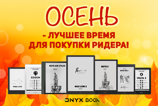 Привет всем любителям чтения и хороших книг! Рады сообщить о проведении акции "Осень - лучшее время для покупки ридера!", во время которой ряд популярных моделей ридеров ONYX BOOX можно приобрести с существенной скидкой. В рамках данной акции можно получить скидку* на следующие модели: ▪ ONYX BOOX Kon-Tiki 2 по цене 21 990 рублей вместо 24 990 рублей. ▪ ONYX BOOX Poke 4 Lite по цене 12 590 рублей вместо 13 490 рублей. ▪ ONYX BOOX MAX Lumi 2 по цене 89 990 рублей вместо 97 990 рублей. ▪ ONYX BOOX Note 5 по цене 53 990 рублей вместо 58 990 рублей. ▪ ONYX BOOX Poke 3 по цене 18 990 рублей вместо 19 990 рублей. ▪ ONYX BOOX Nova Air C по цене 35 990 рублей вместо 39 990 рублей. ▪ ONYX BOOX Volta 3 по цене 10 490 рублей вместо 11 490 рублей. ▪ ONYX BOOX Note Air 2 Plus по цене 49 990 рублей вместо 55 990 рублей. ▪ ONYX BOOX Edison по цене 22 990 рублей вместо 24 490 рублей. Акция пройдет в период с 15 октября по 6 ноября, предложение по ней ограничено запасами товара на складах