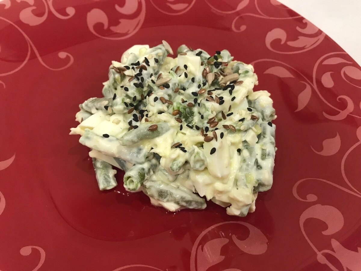 Вкусный и сытный салат из простых и доступных продуктов. Прекрасно подходит в качестве гарнира. Для рецепта нам понадобится: Фасоль зелёная замороженная 400г Яйца куриные вареные 4шт Сыр (любой) 100г Чеснок средний зубчик (5г) Сметана 2 ст.ложки По желанию можно добавить свежемолотый перец 400 грамм фасоли - это обычная (у нас) фасовка замороженных овощей. Чуть больше или чуть меньше - не принципиально. Фасоль отвариваем до готовности в подсоленной воде. На литр воды - пол чайной ложки соли. Доводим воду до кипения, солим, закидываем фасоль. Как закипит - варим 5 минут. Сливаем воду и оставляем фасоль остывать. Чтобы остановить процесс нагрева - обдайте фасоль холодной водой. Вареные яйца нарезаем крупным кубиком. Сыр натираем на крупной тёрке. Чеснок пропускаем через пресс. Соединяем остывшую фасоль с сыром,яйцами и чесноком. Добавляем сметану. И, по желанию, молотый перец. Всё перемешиваем и пробуем на соль. Скорее всего придется досолить по вкусу. Готово! Приятного аппетита! Лайки п