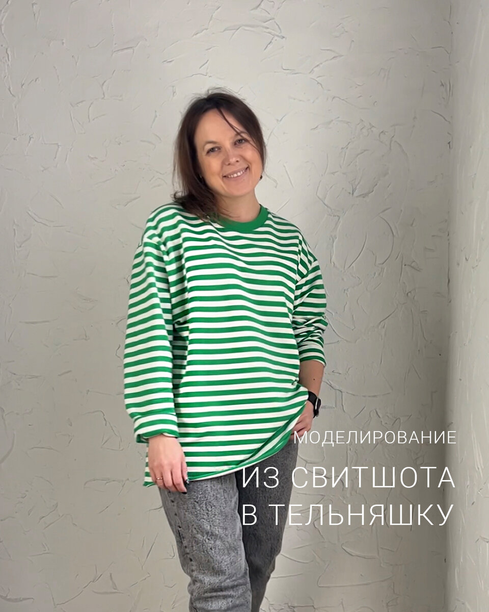 Из свитшота в тельняшку✂️ В этот раз все совсем просто. Берем выкройку свитшота #sewspace_дляменя своего размера и роста. Удлиняем перед и спинку на 10-13см. А теперь рукав. ➡️Делим длину рукава по шву на 2 части. Это примерный уровень локтя. ➡️Заужаем в районе локтя на 3см с каждой стороны и по 1-2см внизу. ➡️Удлиняем на 7-8см. ➡️Соединяем полученные точки плавной линией. Вот и все моделирование😄 Обтачка горловины идёт в комплекте лекал.😉 Примерный расход полосатика 1,4м. А футер 2хнитку в полоску разных цветов вы сможете найти в магазине Red Meter https://redmeter.ru/catalog/2kh_nitka_futer_telnyashki/ Шейте с удовольствием и не бойтесь экспериментировать✂️