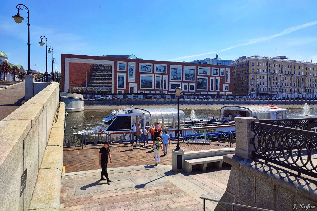 Новый корпус Третьяковской галереи на Кадашевской набережной. Раньше на этом месте был дом XVIII века. Здание построено по проекту архитектурного бюро SPEECH Сергея Чобана. На фасаде изображения известных картин: "Царевна-лебедь" Михаила Врубеля, "Грачи прилетели" Алексея Саврасова, "Неизвестная" Ивана Крамского и др. Плотное размещение как бы намекает на расположение картин в старых музеях и домах коллекционеров, тогда их развешивали по стенам сверху до низу, маленькие картины между более крупными полотнами. Когда-то здесь находилось здание биржевой артели купцов Хлудовых, построенное в 1898 году. Я его не помню. Долго время это был пустырь с закладным камнем и капитель с фигурой женщины. Помню, как я сфотографировала эту инсталляцию и пыталась разгадать, что сие означает. Так и не узнала. Потом участок огородили, долгое время ничего не происходило, что-то ковыряли, затем началось строительство. Там еще был шахтный ствол, возможно, требовалось время для согласований. Новый корпус Трет