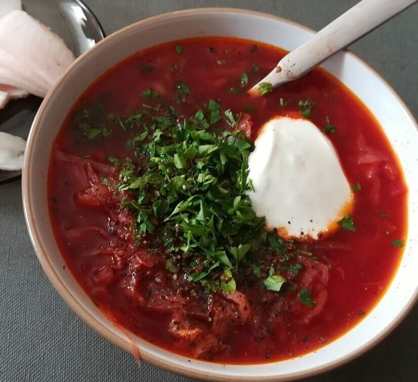 - Разлить борщ по тарелкам, по вкусу заправить сметаной и посыпать зеленью.