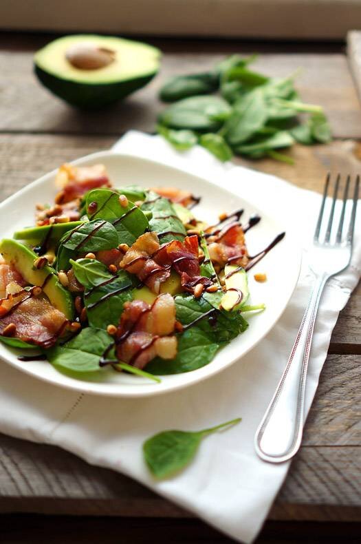 Перед тем, как подавать, соединить макароны с беконом и авокадо, добавить перцы, помидоры и салат. Побрызгать заправкой.