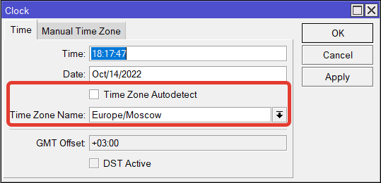 > /system clock set time-zone-autodetect=no time-zone-name=Europe/Moscow