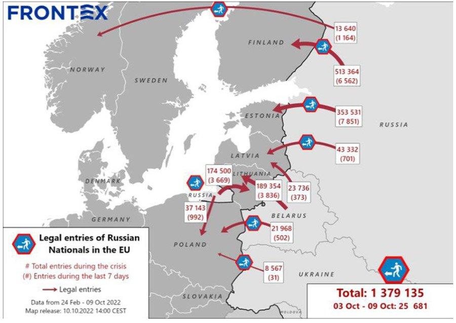 Frontex сообщает, что с 3 по 9 октября 2022 года в Евросоюз въехало 25 600 граждан РФ, наблюдается двукратное снижение количества прибывающих – по сравнению с предыдущей неделей.