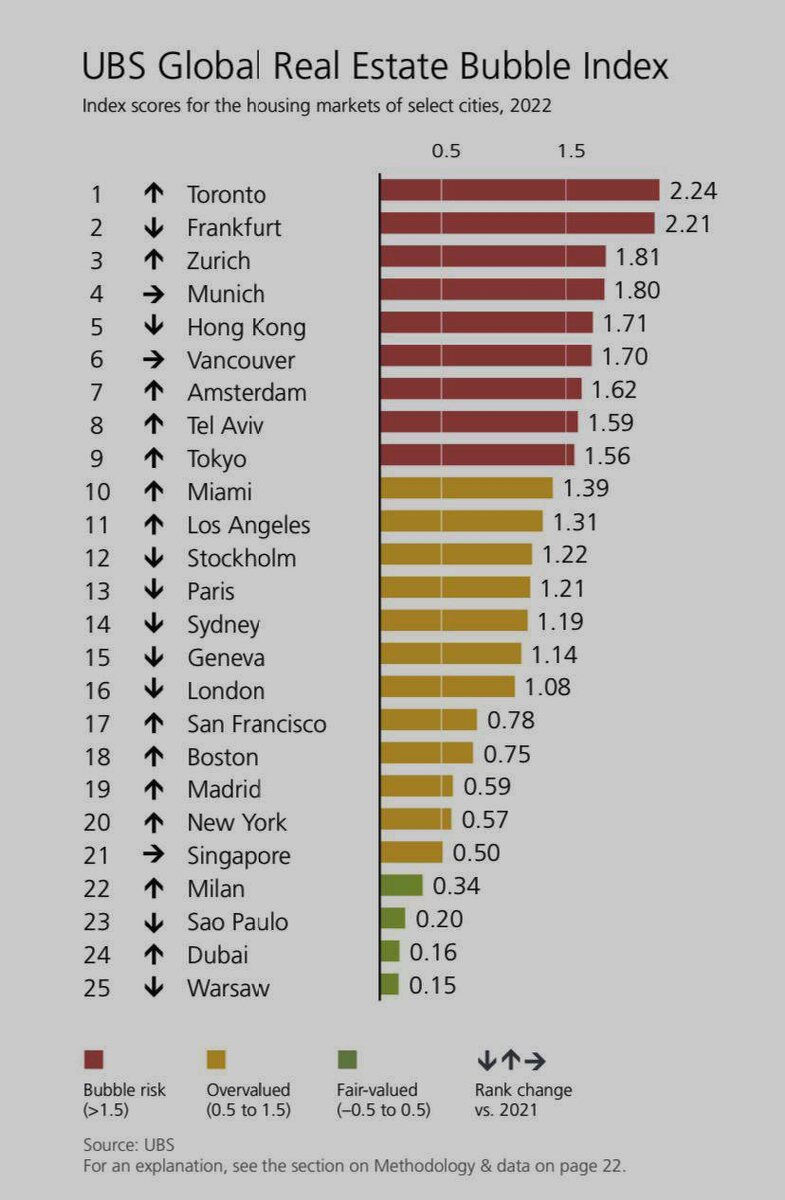 Ежегодно выходит отчет Global Real Estate Bubble Index от банка UBS. На этой неделе вышел новый отчёт за три квартала 2022 года.