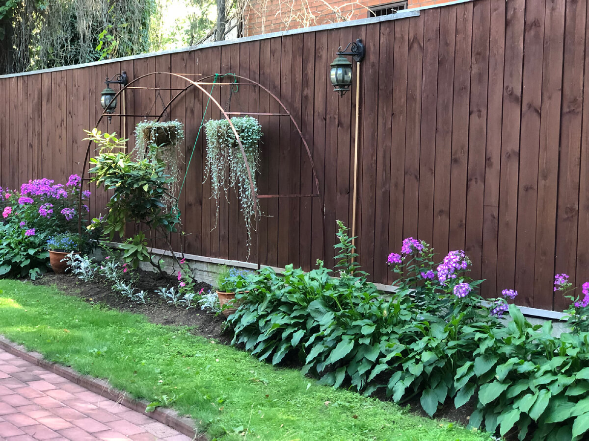 Так уж повелось, что наши участки окружены с четырёх сторон заборами и каждый хозяин участка пытается эти заборы задекорировать. Если разобрать план моего сада, то станет очевидно, что он состоит из двух условно колец. Первый круг это вдоль заборов, второй круг это цветники вокруг всего дома. Набирается приличный погонаж около 400-х сот погонных метров , шириной 1,0 м, кроме партерного газона, там декоративная часть шириной 3,0 м . Цветники вдоль забора все насыпные. Давайте пройдёмся по первому кругу с помощью фото летней и осенней съёмки. Далее этот забор поворачивает, Вот снова поворот, угол оформлен в том же стиле Далее недавно сделанная насыпная гряда. Вдоль забора три металлические арки для подвесных кашпо, а внизу высажены черенки метельчатых гортензий, гейхера Карамель, бузульник и хосты, которые мы оставили в центре правой и левой арки, за правой аркой часть насыпи засажена гортензиями Ванила фрайз Идём дальше. Озеленение забора начинается с этого цветника, который нужно