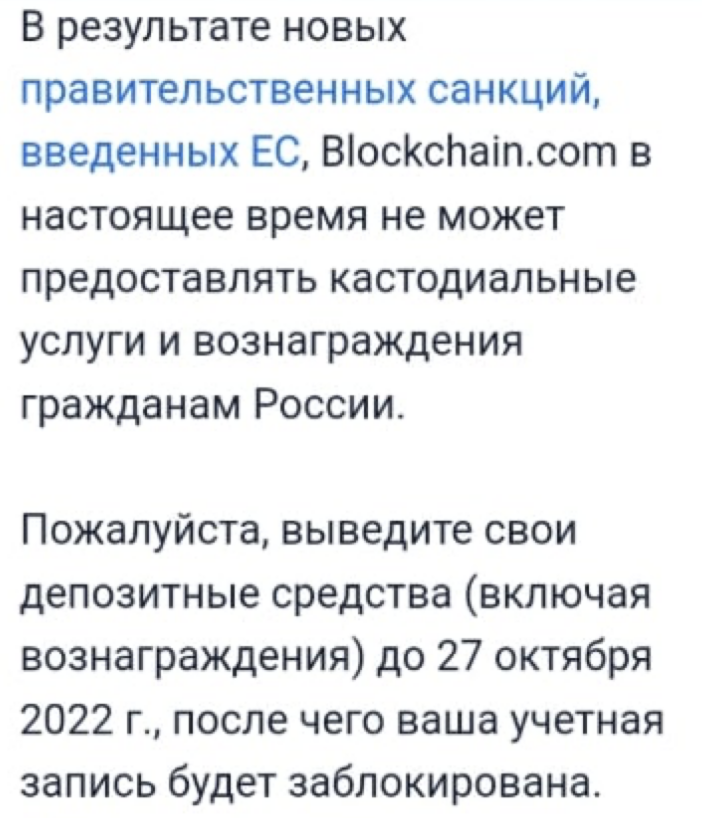 Пользователи сообщают, что Blockchain․com в скором времени начнет блокировать аккаунты пользователей из России — просят вывести средства до 27 октября.
