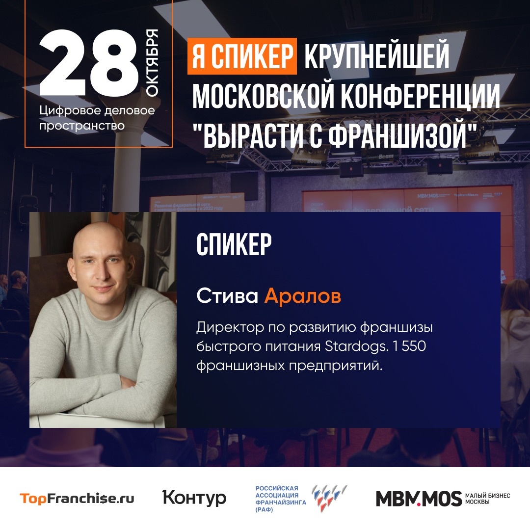 Для всех предпринимателей, кто верит в себя и хочет финансовой независимости - добро пожаловать на франчайзинговую конференцию «Вырасти с франшизой», которая состоится 28 октября в Москве в Цифровом Деловом Пространстве, по адресу Покровка, 47. Директор по развитию франшизы сети быстрого питания Stardogs Стива Аралов выступит с чрезвычайно актуальной темой: "Инвестиционная франшиза. Как создать формат для пассивного участия инвестора. Когда сеть готова к такой модели работы". Выступление спикера построено на самых распространённых вопросах предпринимателей, которые поступают на различных бизнес-платформ. Вы получите ответы на такие актуальные сегодня вопросы: ✔️Когда принимать решение, что пора инвестировать? ✔️Какие преимущества инвестиционной франшизы? ✔️Как обеспечить пассивный доход? ✔️Различие между собственным делом и инвестированием. ✔️Успешные кейсы. И ещё одно, многие хотят отложить открытие своего дела «до лучших времён». А когда были эти «лучшие времена»? Просто кто-то не