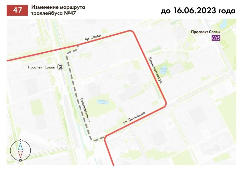 В связи с продлением работ на тепловых сетях до 16 июня 2023 года, продлевается закрытие троллейбусного движения по Белградской ул. от ул. Димитрова до Альпийского переулка. Транспорт направлен: Троллейбус № 47: от конечной остановки «Малая Балканская улица» по действующей трассе до ул. Димитрова, далее по ул. Димитрова, Будапештской ул., пр. Славы, ул. Типанова и далее до конечной остановки «Московская площадь