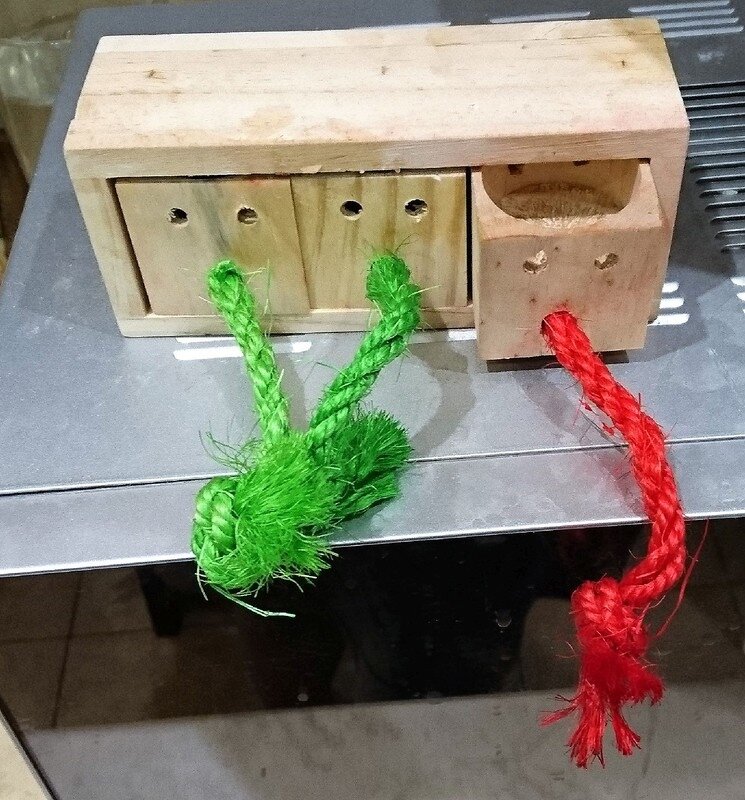 Хозяйка потрясла перед мордой каким-то деревянным ящичком, вроде кормушки для птичек, состоящим из коробки и трёх маленьких ящичков, с привязанными к каждому, яркими верёвками.