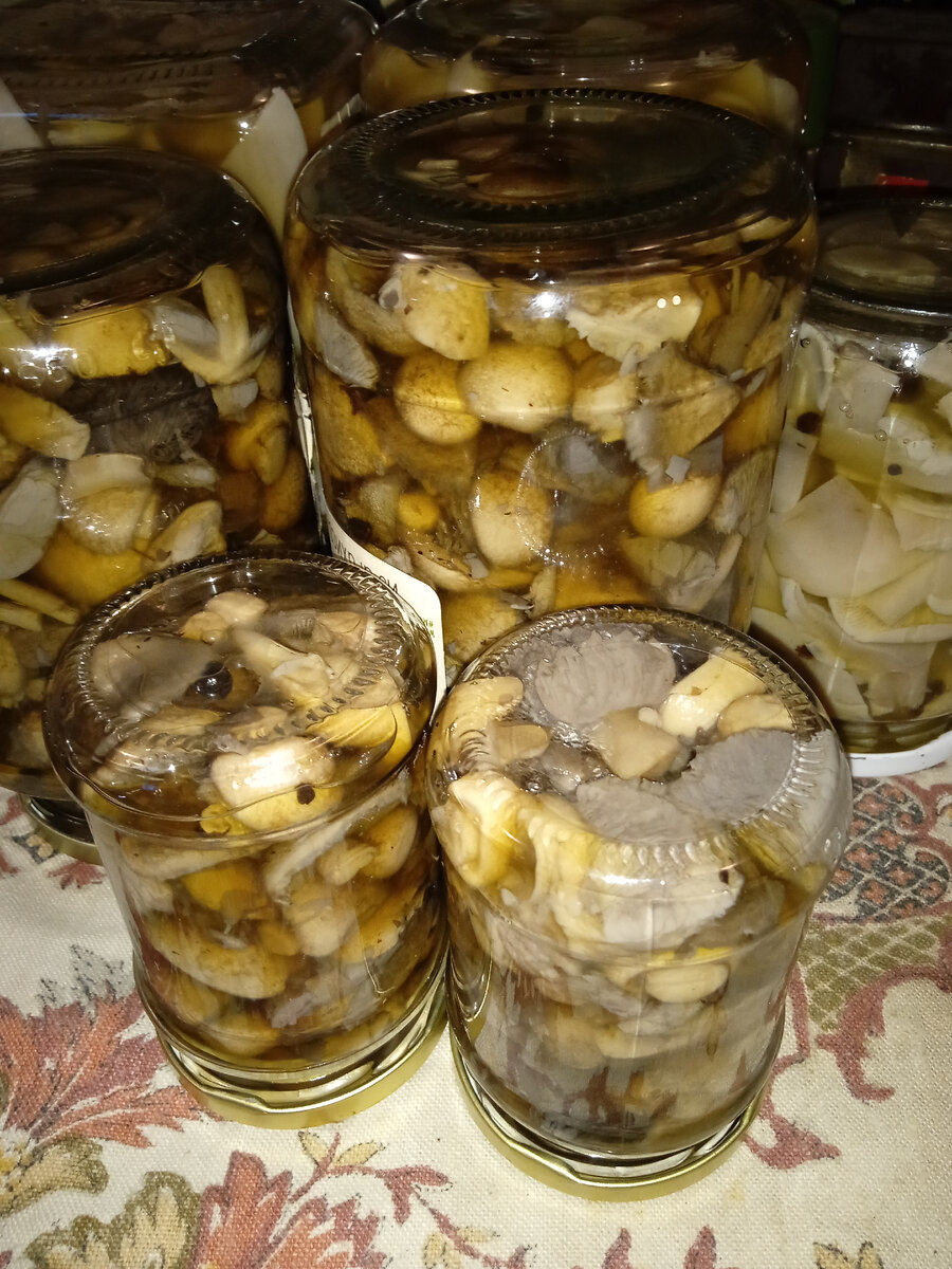 Для начала надо собрать грибы. Мариновать можно любые грибы, но обязательно разбирать по видам и каждый вид грибов мариновать отдельно. Грузди не подходят для этого рецепта. Таким способом я готовила белые грибы, подосиновики, подберёзовики. Лисички тоже закрывала, но это не лучший вид для этого. Вкусными получаются маринованные опята. В основном я мариную так шампиньоны и рядовки. У шампиньонов получается не густой темный бульон. Рядовки дают густой насыщенный бульон и подходят для этого рецепта идеально. Итак, грибы надо очистить от мусора, обрезать повреждённые части, порезать, если слишком крупные и замочить в воде. Шампиньоны лучше промыть в двух, трёх водах, чтобы весь песок и земля отмылись наверняка. В этом году собрали много рядовки лиловоногой, в основном крупные, пришлось резать на части. Вкус у них одинаковый, просто мелкие лучше смотрятся в баночках и на тарелках. Рядовки легче отмываются, в двух водах помыть достаточно. Вымытые грибы надо отварить в подсоленной вод