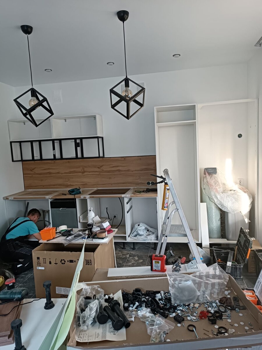 Даже не верится, но кухонный гарнитур собран! С момента первой доставки и начала сборки - прошло две недели. Почему так долго? • Ждали недостающие фасады, больше недели. Не было на складе.; • Выдвижная сушилка для посуды пришла с заводским браком. До сих пор ждём доставку новой. Как только она прибудет на склад, мастер привезёт и установит ее.; • Сложности при монтаже кухонного гарнитура: сборщикам мебели, пришлось помучиться с большим шкафом. Всё дело в системе фильтрации воды, в бойлере и в котлах (электрический, а в последствии газовый). Они занимают целый угол. Как раз их и должен был спрятать большой кухонный шкаф. Ребята, мастерски вырезали дно шкафа, так, что бы разместился наш фильтр. Получившаяся конструкция не имеет задней стенки, практически нет правой стенки и потолка. Зато, функцию свою она выполняет на ура! Сложности поджидали и при установке сифона под раковиной. Раковина двойная, соответственно купили двойной сифон, стандартный, но в комплекте, как будто не хватало д