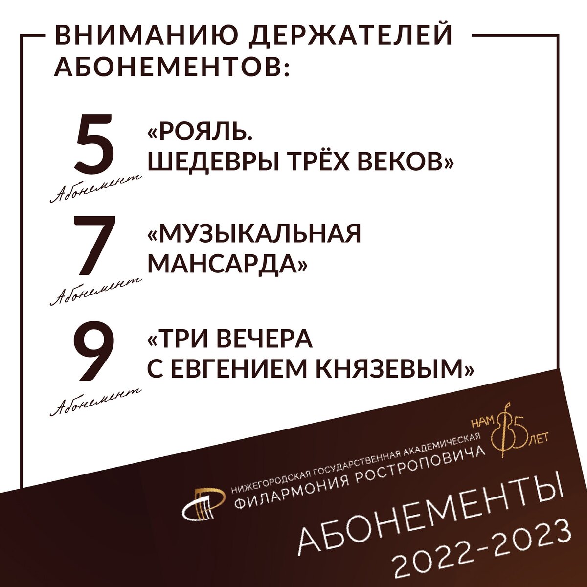 🗓17.10.22 Абонемент №7 «МУЗЫКАЛЬНАЯ МАНСАРДА» ❗В связи с болезнью солистки 1-й концерт абонемента, запланированный на 17 октября, переносится на 10 ноября. 🗓27.10.22 Абонемент №5 «РОЯЛЬ. ШЕДЕВРЫ ТРЕХ ВЕКОВ» ❗Константин Лифшиц не сможет принять участие в концерте, запланированном на 27 октября. Абонементный цикл откроет лауреат международных конкурсов Филипп КОПАЧЕВСКИЙ. 🗓2.11.22 Абонемент №9 «ТРИ ВЕЧЕРА С ЕВГЕНИЕМ КНЯЗЕВЫМ» ❗Концерт, объявленный на 2 ноября, переносится на 20 декабря. ❗Концерт, объявленный на 3 декабря, в свою очередь, переносится на 11 ноября. Таким образом, программы цикла расположились в следующем порядке: ▪11 ноября (Пушкин – «Пиковая дама») ▪20 декабря (Мериме – «Кармен») ▪3 марта (Пушкин – «Моцарт и Сальери», «Каменный гость») !!! Абонементы и ранее приобретенные билеты действительны.