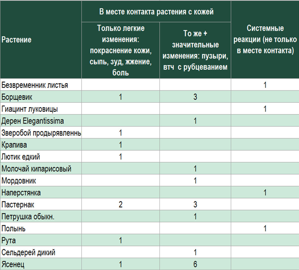 Вот что получилось по растениям, поражающим кожу при прикосновении: